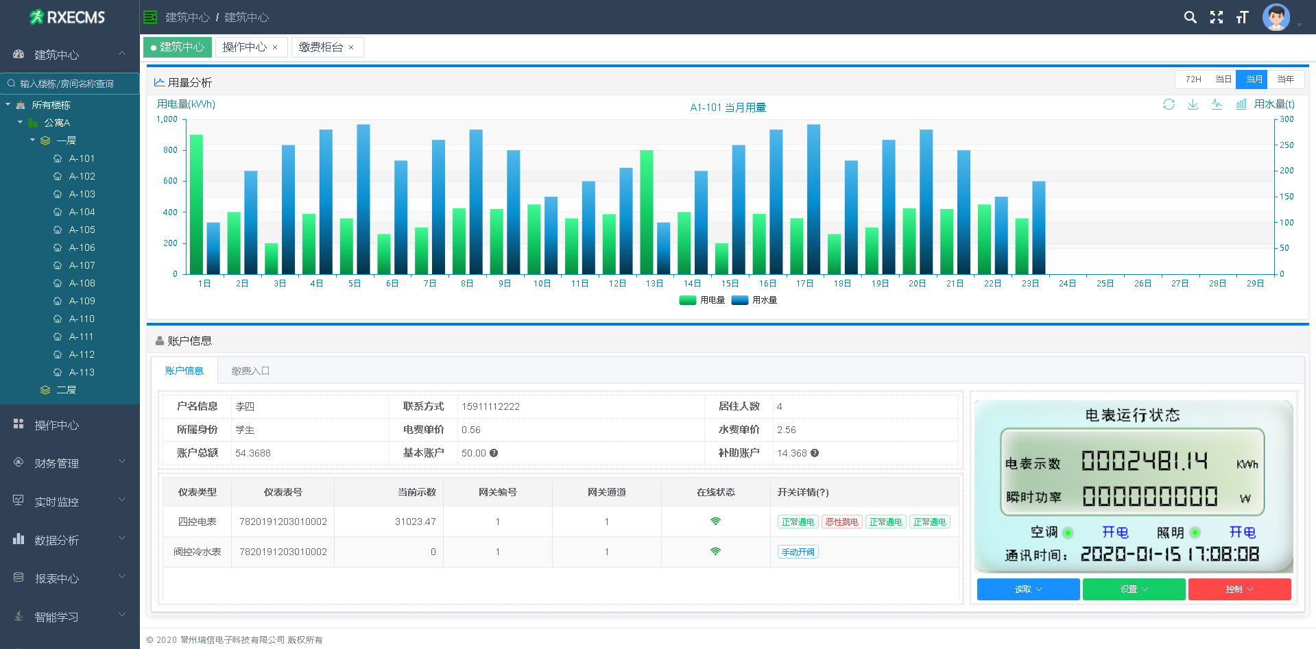 瑞信科技公寓智能用电管理系统是我公司开发的一套专门针对高校公寓特点和管理功能需求,用于高校学生公寓的电能计量监管系统,尤其是针对公寓安全管理方面有自己的独到特点。根据功率因素识别恶性负载使用,成功研制反限电插座识别模块,有效禁止违章电器使用,确保学生宿舍的安全管理。根据学校管理要求可进行单路、双路、三路、四路的计量、识别、管控。系统软件为模块化结构,具有基础信息管理、计量收费管理、设备监测管理、安全管控管理、账户数据管理、统计报表管理、巡检报修管理、第三方接口管理等丰富功能模块。