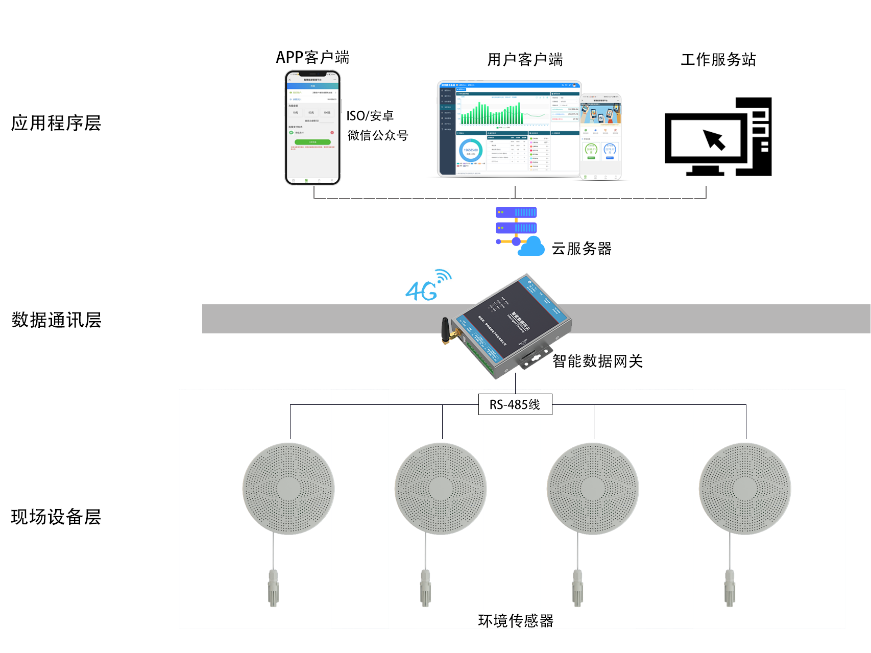 可测量温度、湿度、PM2.5、PM10、TSP、大气压力、光照、噪声、异味、TVOC、CO2、甲醛、O3、CO、CH4、O2、SO2、NO2、H2、H2S、NH3、烟雾等多种要素。